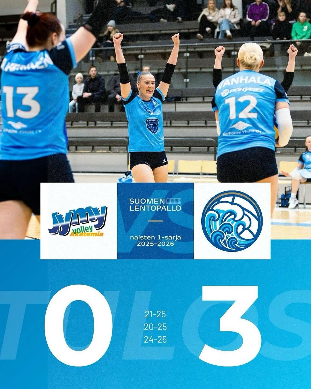 Vierailu Nurmossa antoi kotiinviemisiksi tärkeät sarjapisteet! Ottelu ei ehkä ollut täysin ehjin suoritus Jujulta, mutta tärkeä 3–0-vierasvoitto JymyVolley Akatemiasta tuli silti napattua. (21-25, 20-25, 24-26) Vastustaja puolusti hyvin, ja jouduimme tekemään paljon töitä pisteiden eteen, mutta se palkittiin tänään 3 pinnalla! Nyt kohti kotoista Pohjois-Karjalaa… 🚌🩵🙏🏻